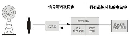 电波钟表作为一个系统的技术原理是:首先,由标准时间授时中心将标准时间信号进行编码(商业码则进行加密),利用低频(20kHz~80kHz)载波方式将时间信号以无线电长波发播出去。电波钟表通过内置微型无线电接收系统接受该低频无线电时码信号,由专用集成芯片进行时码信号解调,再由计时装置内设的控制机构自动调节钟表的计时。通过这样一个技术过程,使得所有接收该标准时间信号的钟表(或其他计时装置)都与标准时间授时中心的标准时间保持高度同步,进而全部电波钟表显示严格一致的时间。
