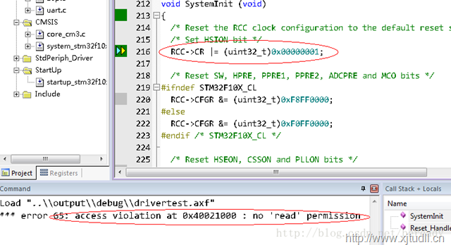 问题描述:使用MDK进行软件设计时没有使用ST官方的模板而是手动建立的工程,使用ST官方提供的3.5版本固件库。编译完全通过,在使用软件仿真时出现问题,表现为程序无法跳转到main入口,直接在SystemInit()函数就无法执行,调试窗口出现如标题所示的错误信息: