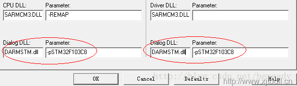 正确配置应该为dialog dll:DARMSTM.dll parameter:-pSTM32F103C8