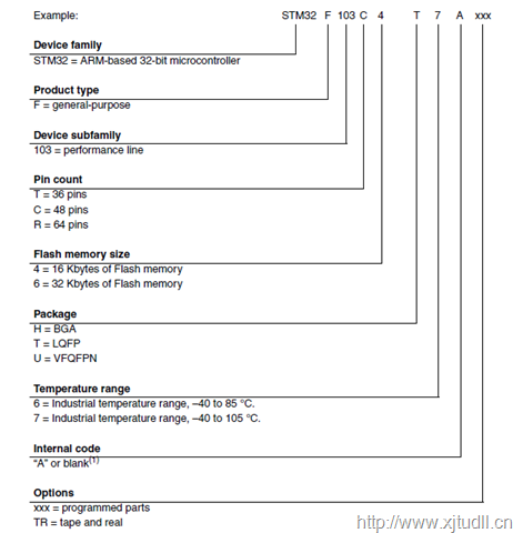 为何使用的是STM32F103C8T6,参数却只能是STM32F103C8,这个原因是因为根据ST公司的MCU命名规则,到C8这个位置就已经完全规定了仿真所需要的所有参数,包括cpu频率,ram容量,flash容量,外设资源等内容。型号中后边的部分都已经和仿真无关了,例如后边的名字主要代表了MCU的封装,工作温度等。官方命名规则如下图: