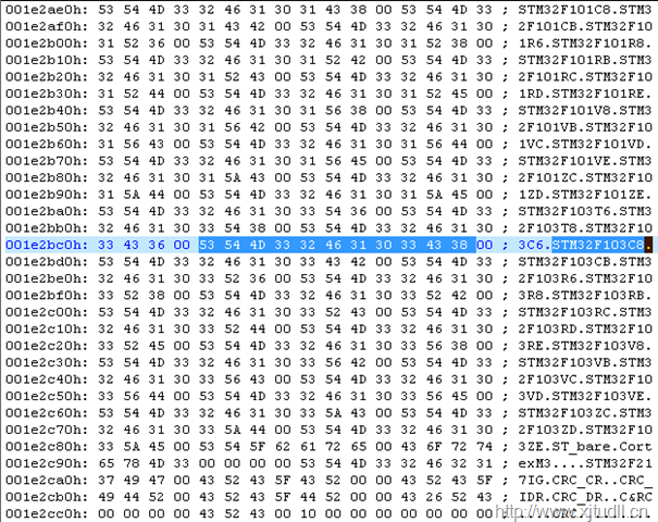 当然还有一个更加直接的原因是DARMSTM.DLL这个动态链接库文件中没有详细的MCU型号,我们可以通过使用工具打开动态链接库文件查看证明,如下图所示,图中可以清楚的看到一个MCU的型号只有11个字符,不包括后边的其他参数字符。