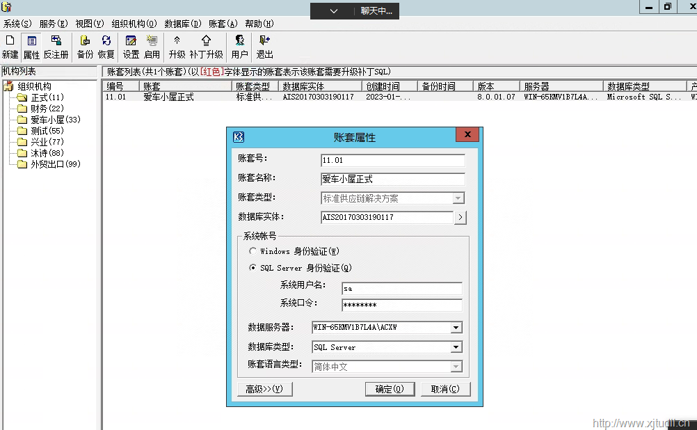 打开账套管理--点击异常账套--点击左上角的属性,检查配置的身份是不是SQL server身份认证,是不是没有填写sa的密码。