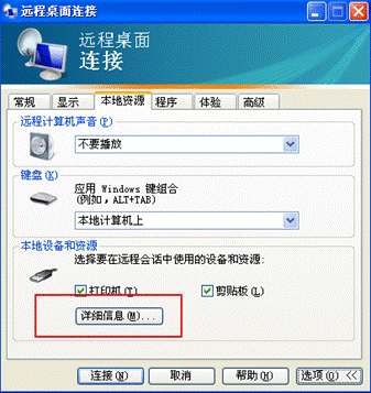 第二步:选项框出现后,切换到【本地资源】,在【本地设备和资源】选项中,点【详细信息】。如图所示。
